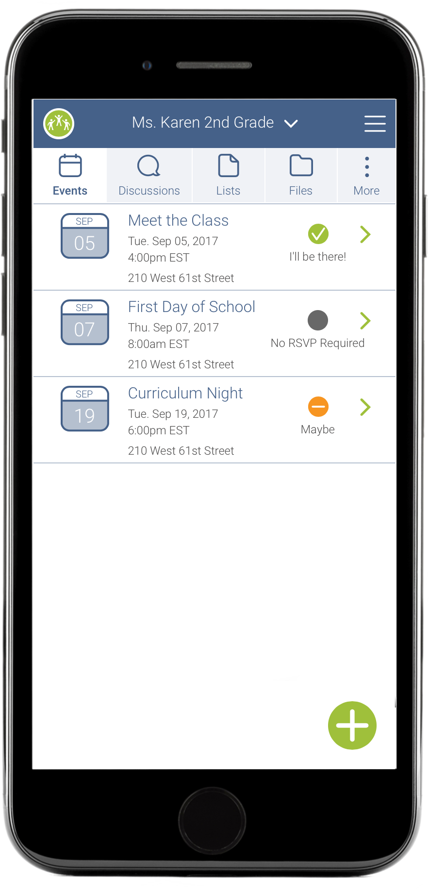 Using our Events feature, it's easy for everyone to find out about an upcoming event that's just for the class. You can even require an RSVP to keep track of attendees. If people are slow to respond, our system sends out reminders automatically so you don't have to.