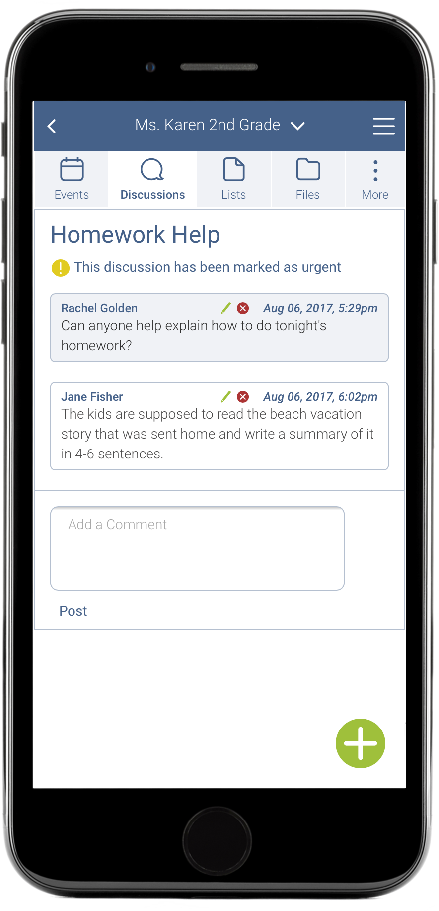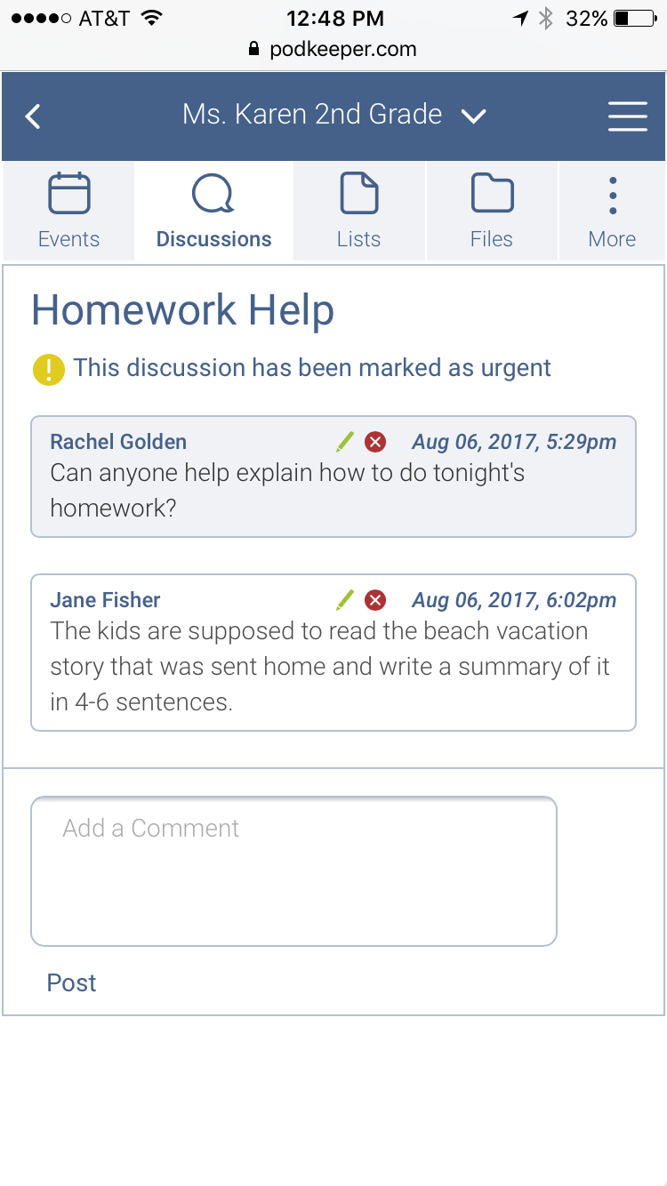 When a parent has a question about a homework assignment, they can ask the question in the Pod and any parent can respond with an answer. The burden doesn't always have to fall on you because now you have partners in effective classroom communication.